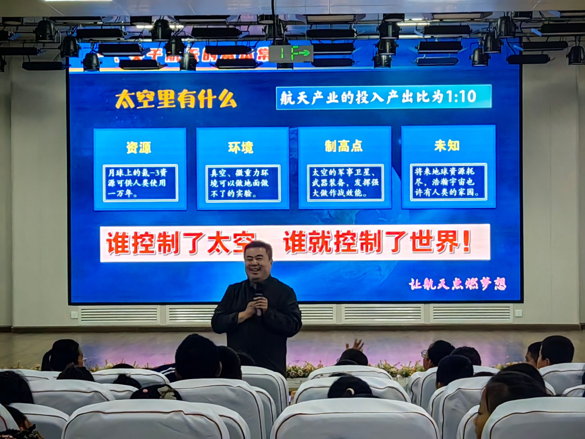 本次講座以“航天點燃夢想”為題,侯冀老師以五段精心設計的篇章為內容,引領師生穿梭于浩瀚星海。他從“關于航天的基本常識”的基礎科普,到“人類的航天夢想與實踐”的歷史追溯,從“中國航天的發展歷程與輝煌成就”的激情講述,到“未來的中國航天”的前景展望,最后以“讓航天點亮夢想”的勵志分享收尾,完整呈現中國航天波瀾壯闊的發展畫卷。