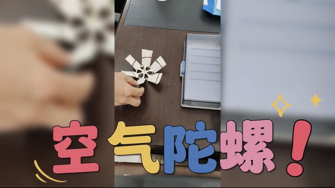 第二小學的陳沖老師和李璐璐老師給大家帶來了“火山爆發”和“空氣陀螺”兩個實驗秀。油和水密度不同,倒在一起產生了分層現象,再加入泡騰片,泡騰片溶于水后產生氣體,沖出油層宛若火山爆發一般。口吹空氣陀螺實驗利用一個一次性紙杯,杯壁剪成風輪葉片,杯底鏤空,中間插一根小棍做成轉軸,就做成了一個簡單的桌面小玩具——桌面口吹陀螺。