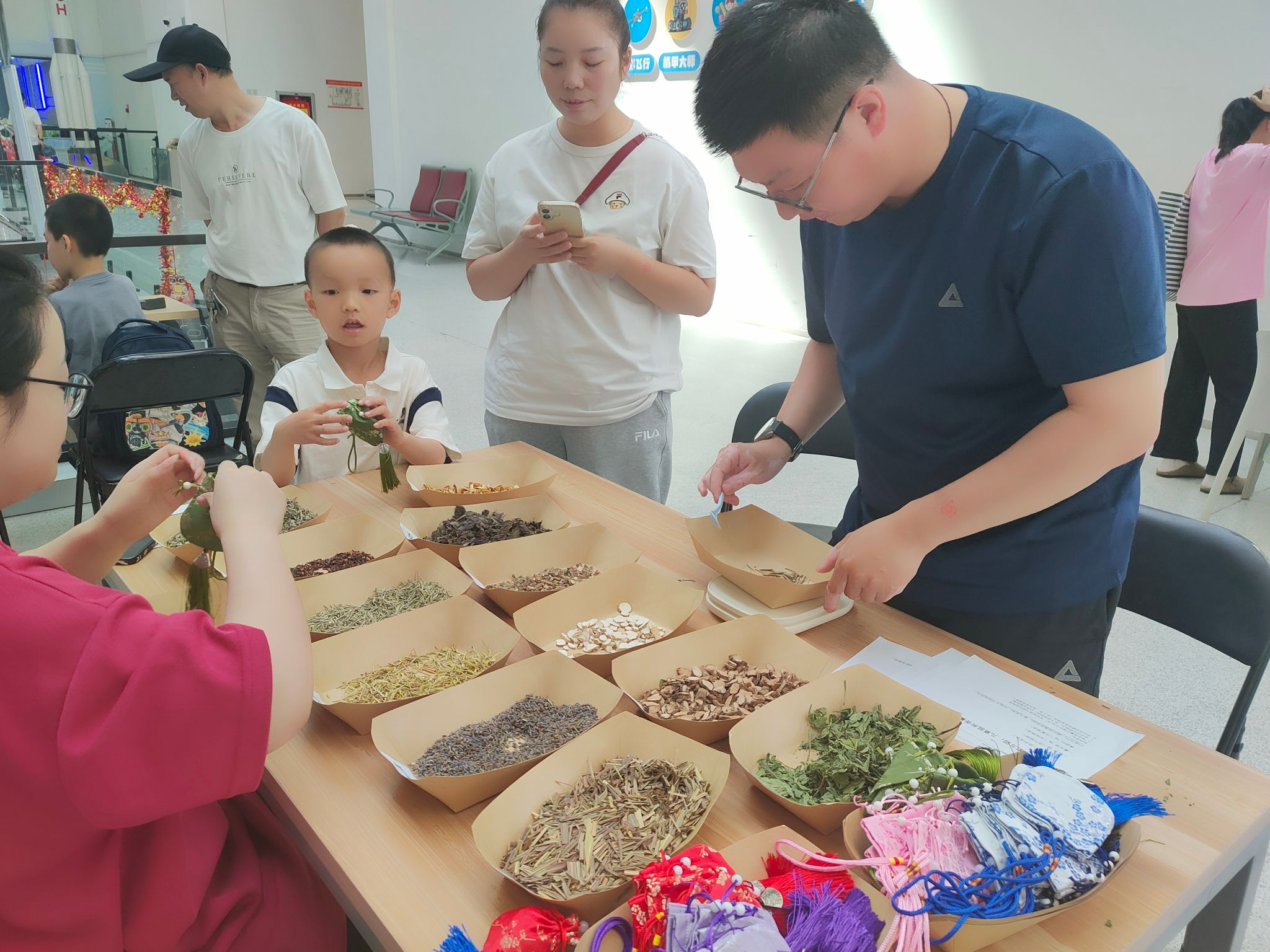 科技館大廳里充滿了節(jié)日氛圍,各族游客踏著艾葉入場,用木蘭湯洗手祈福,接受朱砂點額,感受古人安康祝愿;詩詞飛花令攤位前,身著漢服的科普輔導(dǎo)員與游客對答詩詞,笑語晏晏;游客組隊參與模擬劃槳競技、釣粽子、投壺、射五毒等互動游戲熱鬧非凡;手工與科學(xué)探索類項目則成為親子家庭的焦點,游客親手制作艾草錘,在填充艾草、學(xué)習(xí)“拍八虛”等養(yǎng)生知識中感受傳統(tǒng)技藝與健康理念的結(jié)合;“奇妙科學(xué)三重奏”通過手搓龍卷風(fēng)、靜電懸浮氣球等實驗揭秘科學(xué)原理;組裝橡筋動力飛機、制作皮筋動力龍舟并進行競速比賽,讓孩子們在動手實踐中探索機械動力的奧秘;科學(xué)香囊工作坊里,玫瑰、薰衣草、艾葉等草藥散發(fā)清香,游客們按比例調(diào)配功效香囊,解鎖植物安神、助眠的科學(xué)功效。這些豐富多彩、新穎有趣的科普活動,讓游客們沉浸式體驗了傳統(tǒng)文化與現(xiàn)代科技的融合魅力,現(xiàn)場歡呼聲此起彼伏。