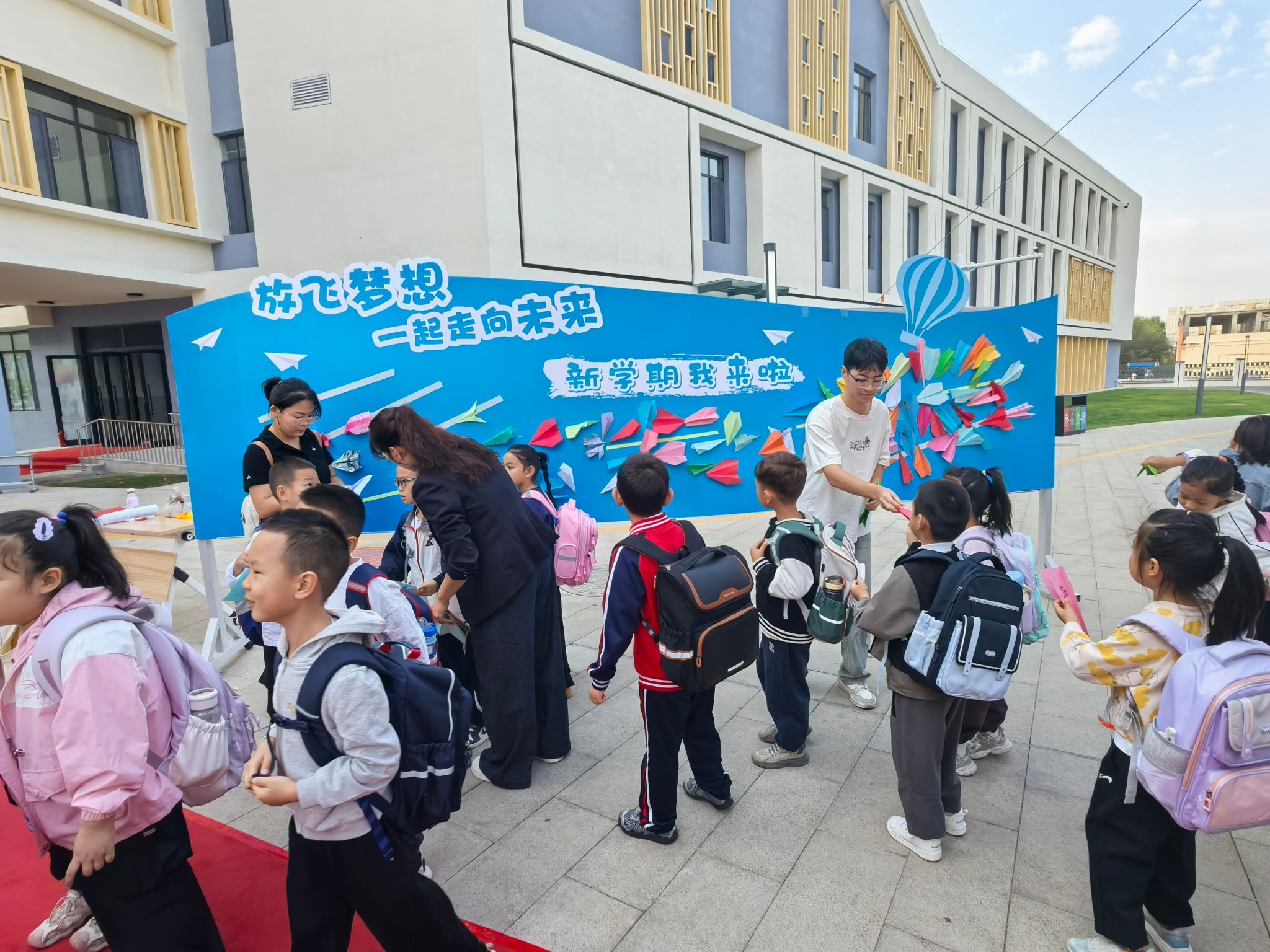 清晨的東彩小學門口,科技館的大黃蜂機器人揮“臂”迎接新同學,指引至簽到區;同學們將寫有名字與心愿的專屬紙飛機貼紙粘貼到“夢想啟航”的展板上,滿是童真與期許。