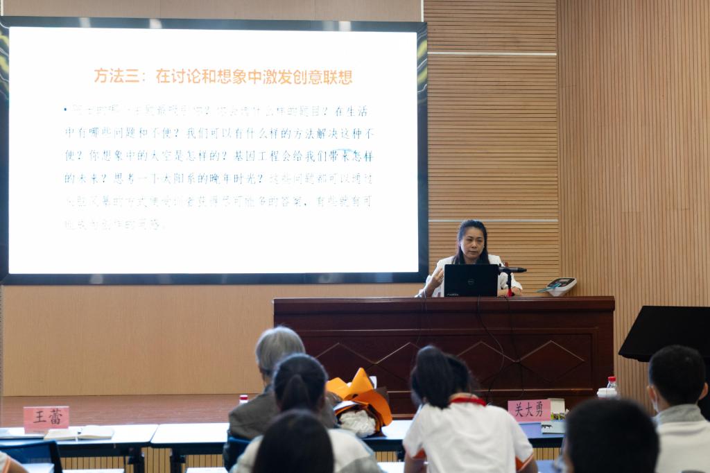 吳教授以十大院士研究的中國前沿科技為切入點,深入淺出地為參加講座的學生和老師講述著一個又一個中國前沿科技成果,指導老師們如何把科學融入日常課堂,同時還針對中國前沿科技,向接受培訓的老師們分享了許多可實施的科幻畫主題,提供了豐富多彩的兒童科幻畫引導方向。