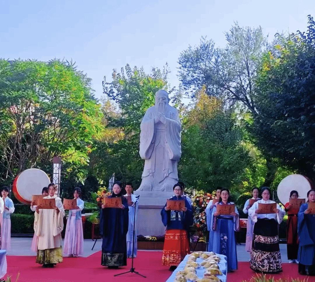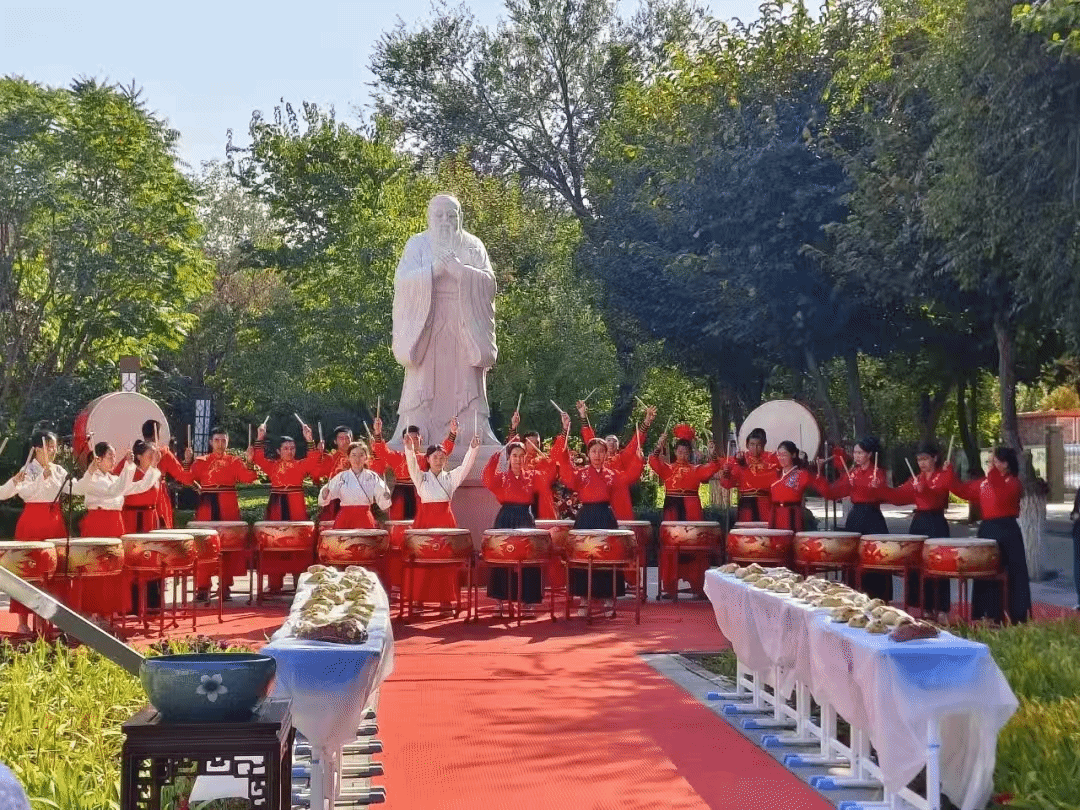 在昌吉市第一中學的孔子誕辰紀念活動中,鼓舞表演以《象王行》為律,通過節(jié)奏與隊形的變化呈現(xiàn)“門扉開啟”的視覺意象,隱喻“知識之門”的打開。主祭官及師生代表行凈手、整衣、獻花之禮,以莊重儀式傳遞對先賢的敬意,同時也體現(xiàn)了行為心理學中“儀式感”對集體認同的強化作用。誦讀《論語》《大學》等經典篇章,不僅展現(xiàn)語言韻律之美,更暗合認知科學中“韻律記憶”對知識長期留存的有效性。