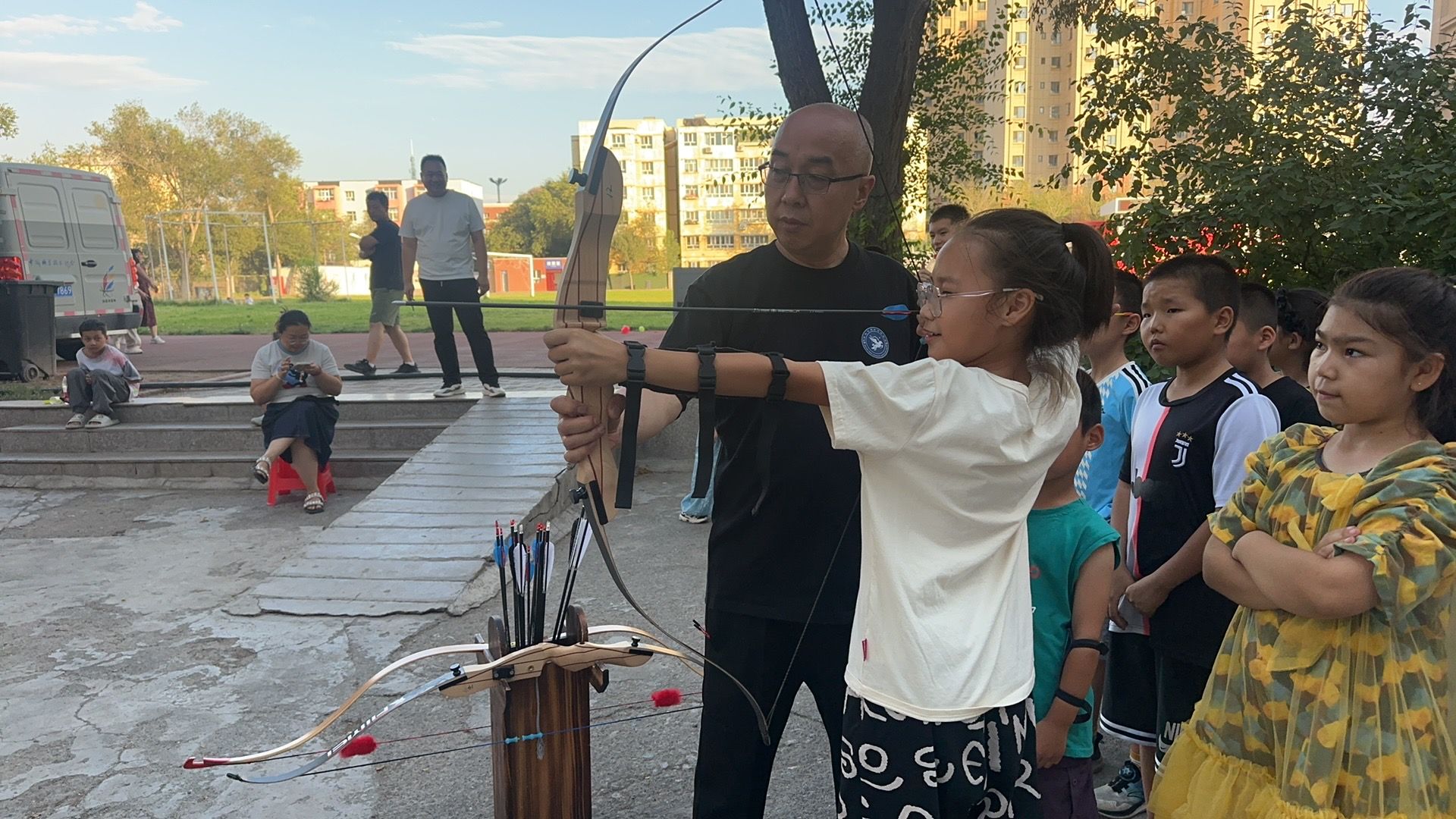 活動的高潮部分,是邀請到西域射藝俱樂部的專業人員為現場小朋友進行非遺文化——射箭教學體驗。小朋友們有序排隊,認真聆聽講解,在專業指導下,不少小朋友成功射中靶心,收獲了滿滿的成就感,現場掌聲和歡呼聲不斷。