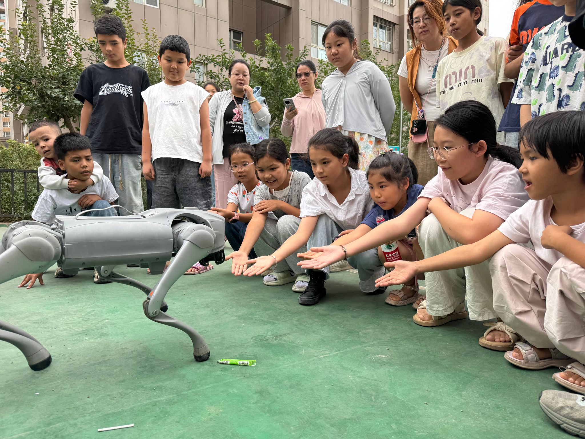 備受小朋友們喜愛的機器狗也來到現場,它靈活的身姿、可愛的動作萌翻全場。機器狗不僅能熟練地完成翻跟頭、打招呼等動作,還熱情地與小朋友們握手互動,讓孩子們真切感受到了人工智能的魅力。小朋友們興奮地圍在機器狗身邊,紛紛伸出小手,爭著和這個可愛的“小伙伴”親密接觸。
